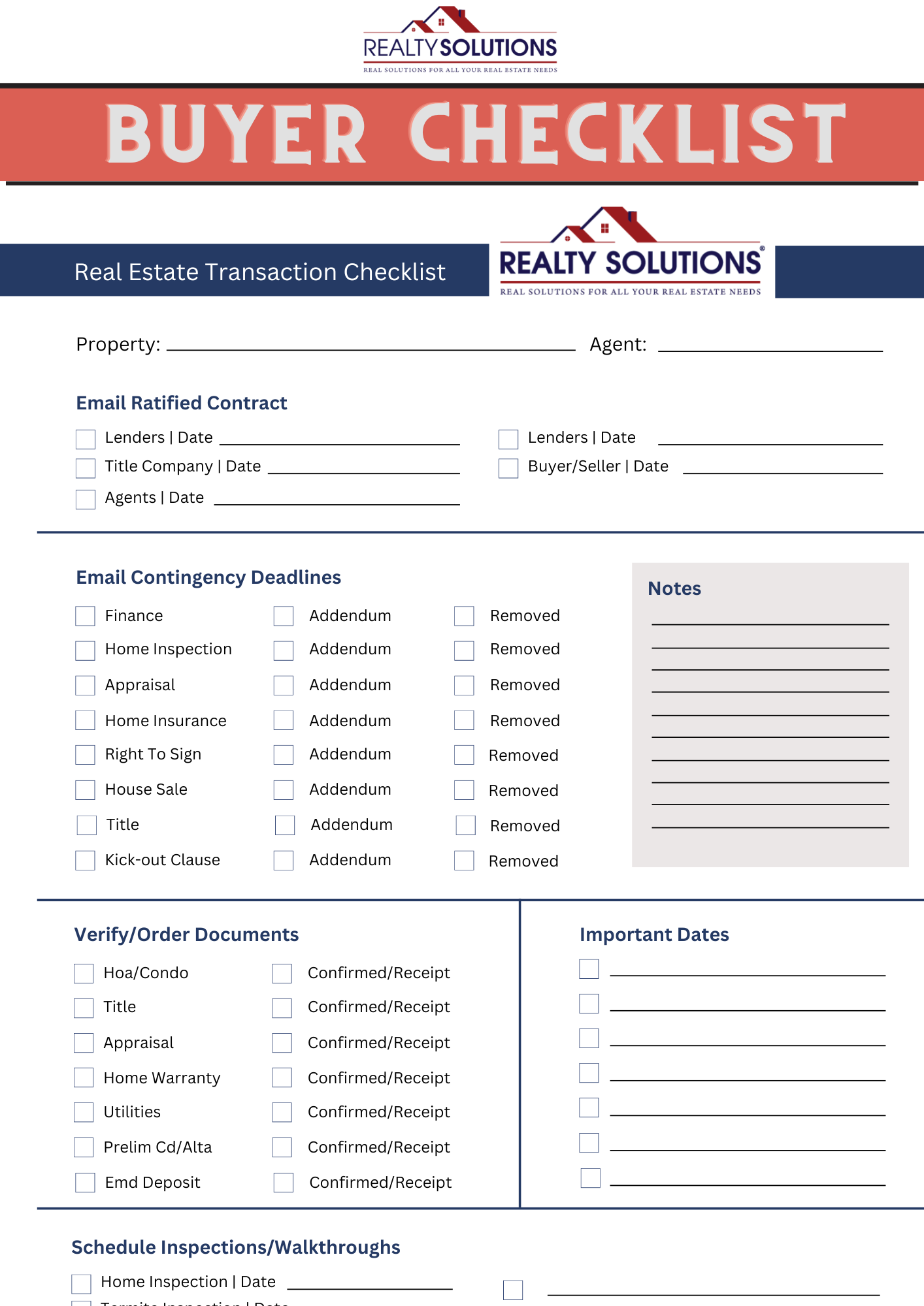 Buyer & Seller ChecklistsClick below to download our Realty Solutions Buyer & Seller Comprehensive Checklists.Remember, you only get one opportunity for a lasting first impression!